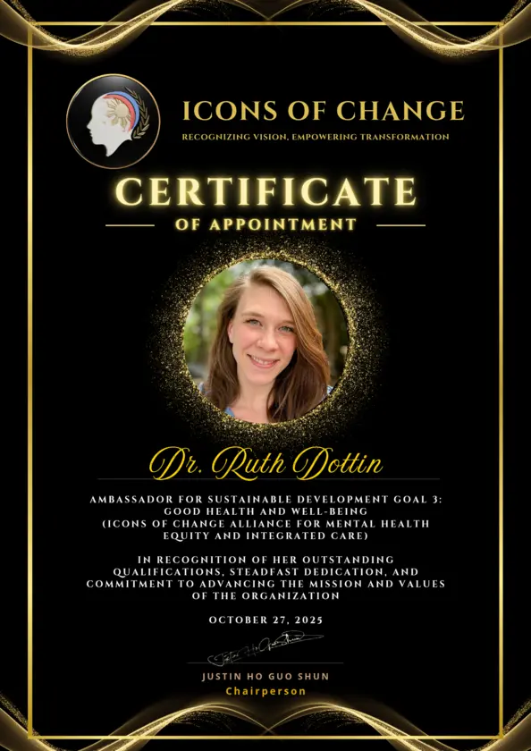 As Ambassador for SDG 3 Good Health and Well-Being, Dr. Ruth Dottin represents a global movement to place mental health at the center of sustainable development. Her work bridges the gap between physical and psychological wellness, championing systems that promote prevention, equity, and community resilience. She envisions a world where mental health care is integrated, inclusive, and inherently human—a cornerstone of collective well-being rather than a specialist’s afterthought.