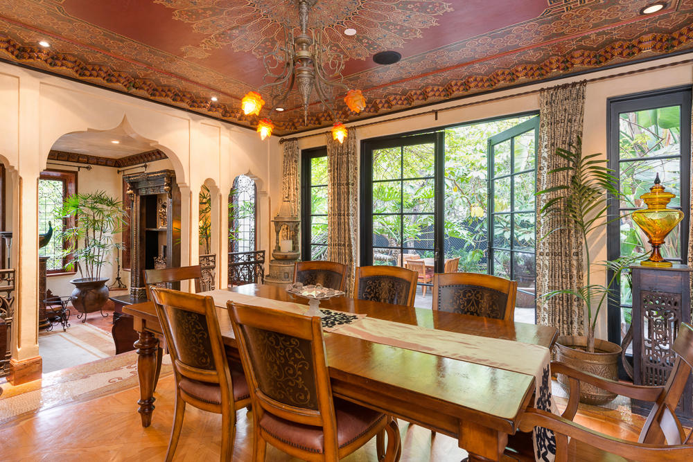 The dining area which features intricate moor designs seen in the carvings of the chairs, walls and chandelier.