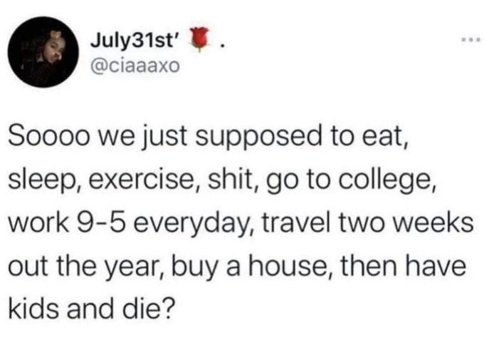 Eat, sleep, exercise, go to college, work, travel 2 weeks, buy a house, have kids, die?
