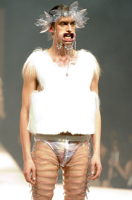 This is one of the worst model I have ever seen, he wearing white fur vest and plastic see through pants