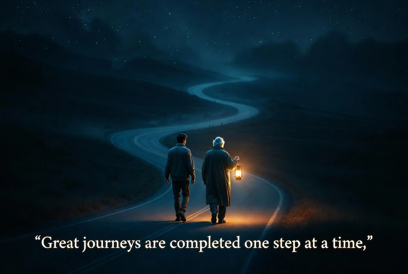 The old man smiled calmly and replied,“My son, this lantern only shows me a few steps ahead… but that is enough.”
