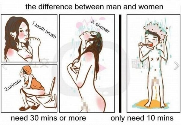 Here is a good difference between men and women and probably one of the most overlooked. A woman brushes her teeth showers and urinates separately. A guy does it all at the same time.