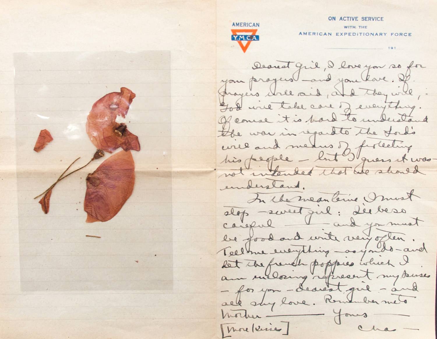 In the meantime I must stop – sweet girl, I will be so careful and you must be good and write very often. Tell me everything as you do and let the French poppy which I am enclosing represent my kisses for you – dearest girl, all my love. Remember me to mother – yours Chas (more kisses).