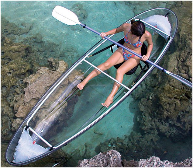 This canoe-kayak hybrid has a transparent polymer hull that offers paddlers an underwater vista of aquatic wildlife and waterscapes unavailable in conventional boats. Seating two people, the sturdy canoe hull is made of the same durable material found in the cockpit canopies of supersonic fighter jets. Easy to maneuver, the wide canoe displaces a greater amount of water for more surface stability, and the paddlers sit lower to the deck, resulting in better balance. Adjustable seats allow paddlers of different heights to personalize their leg room. With a lightweight anodized aluminum frame, it can be easily stored or transported to and from the water. Includes two double-headed paddles, a water bailer, and two flotation devices. For ages 16 and up with parental supervision on calm water and while wearing a U.S. Coastguard-approved life vest. Weight capacity 425 pounds. 33 1/2" W x 133" L x 11" D. (40 lbs.)