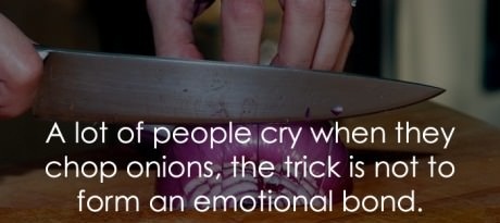 A lot of people cry when they chop onions, the trick is not to form an emotional bond! See no more tears! Cut that onion and never shed a tear again...