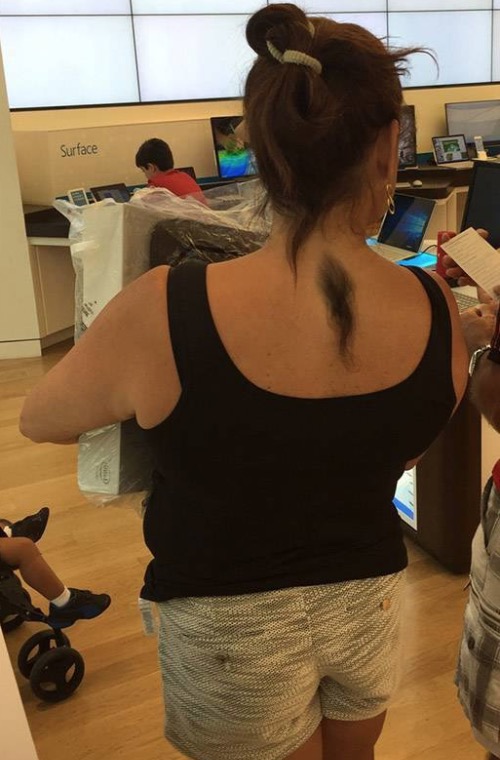 I don't know how she is hair growing out of her back like that. It looks like her back is growing a mullet. Maybe she is part wooly mammoth? Gross!