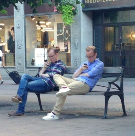 Look at this two guy sitting on the bench playing with there phones on weight their look alike I guess the there's a glitch in the matrix