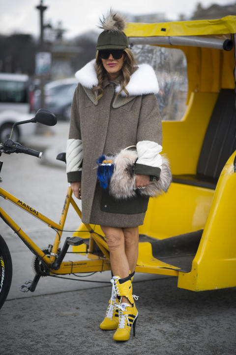 Another epic failed attempt to combine practical sneakers and stylish heels. When will these people realize that sneakers just won't go well with heels? The style icon and editor-at-large for Vogue Japan Anna Dello Russo wore Jeremy Scott for Adidas sneakers/heels shoes in Paris.