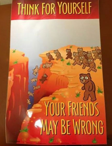 My school has a weird motivation porter "Think for yourself your friends may be wrong" Don't follow the herd of bears.