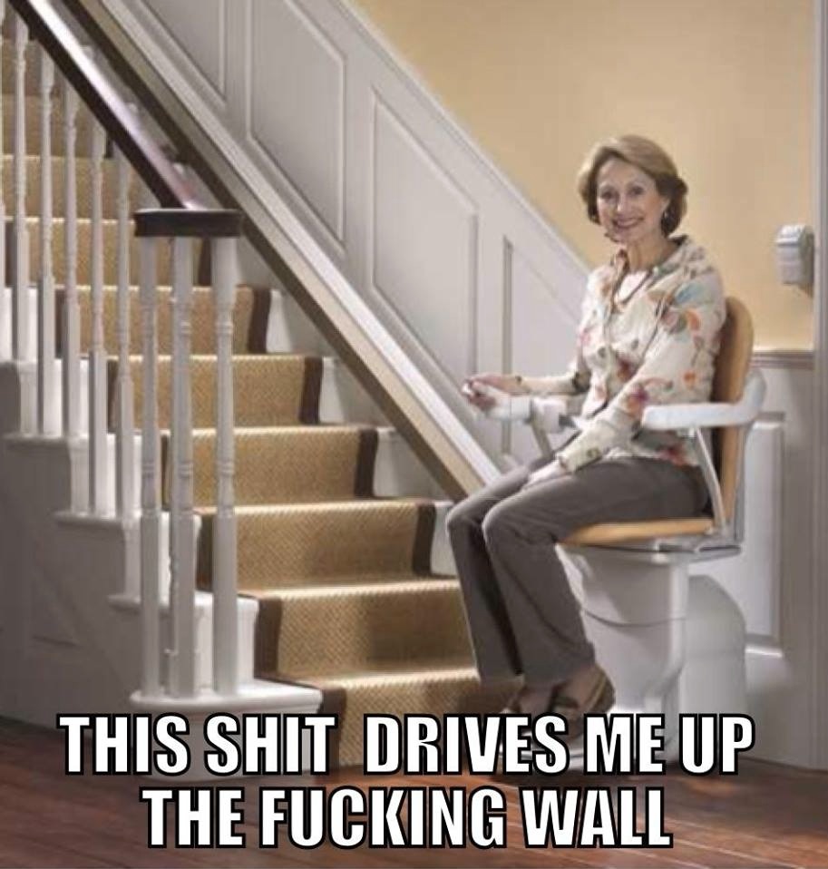 This woman is driving herself up a wall literally! Just sit in the chair and drive yourself up the stairs. I'm sure it beats falling down the stairs and getting hurt.