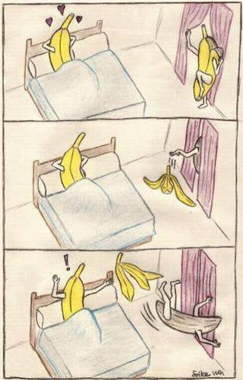 A banana was trying to get to bed and so she peeled herself and then she sleeps on that peel and falls down