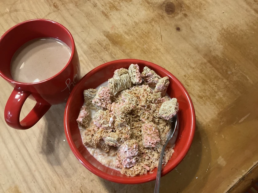 this is my breakfast this morning frosted mini wheats strawberry and coffee