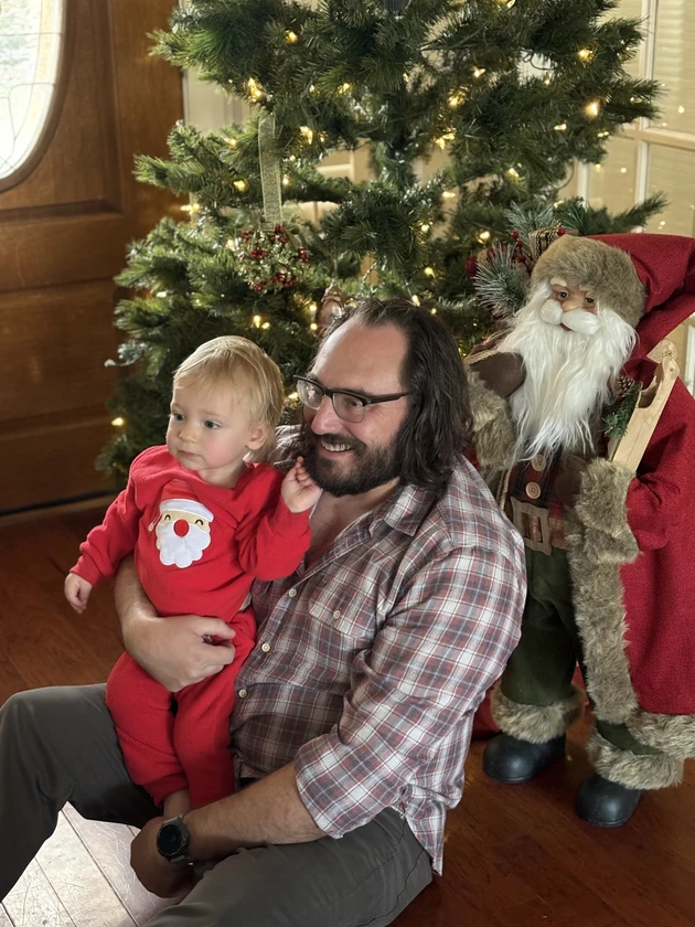 this is my brother and his son Asher next to the Christmas tree 2025