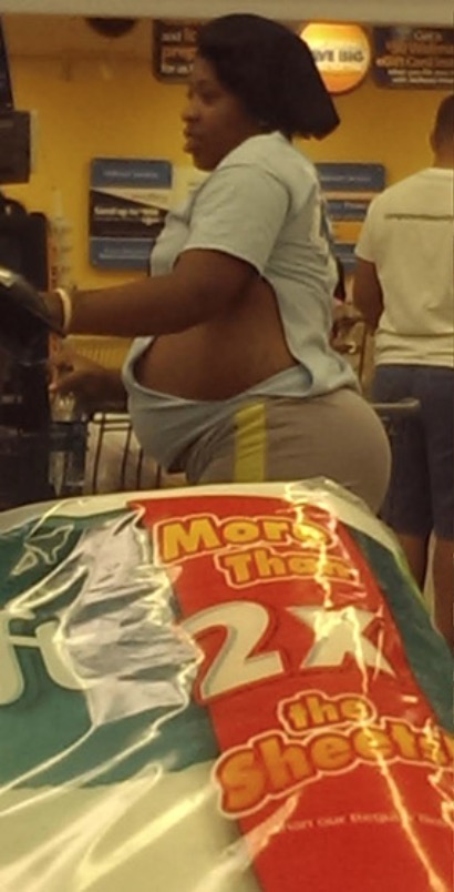 I think she can grab some toilet paper and stuff it into her sides to cover up some. Half her body is sticking out! Looks like it ripped.