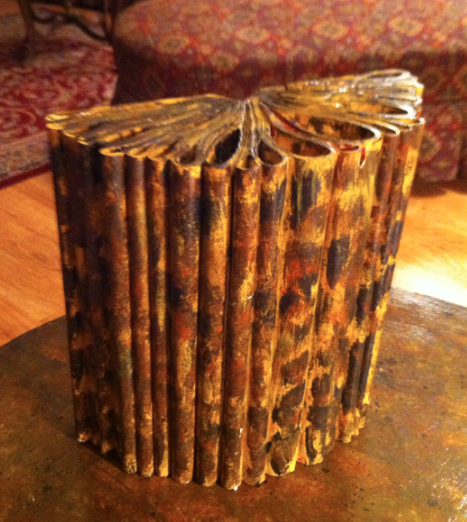 Take a medium to large phone book and fold each page to the middle of the phone book without creasing the pages. Take red, black, brown and yellow acrylic paints and paint smudges and dots of paints and all surfaces until it is completely covered. When dry, apply 2 coats of varnish or shellac to seal and protect the surfaces. Allow to dry.