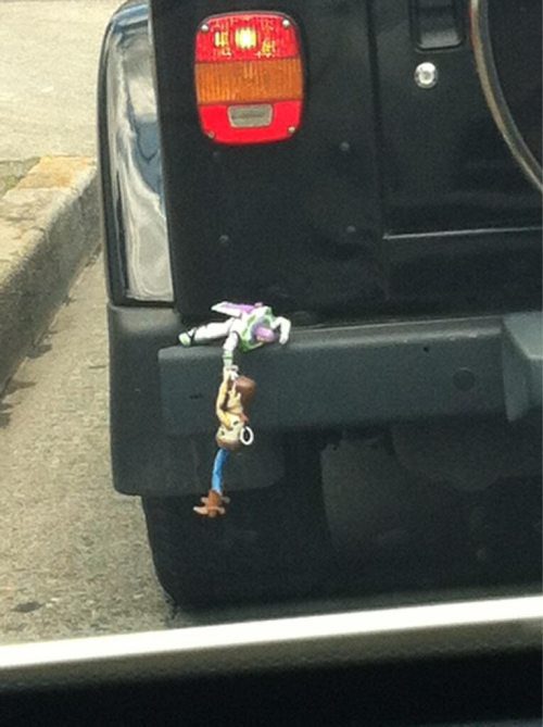 These little guys are taking a ride on the back of your car! Hang on Woody Buzz will save you! People tailgating you will love to watch these animated characters hitching a ride on the back of your car!