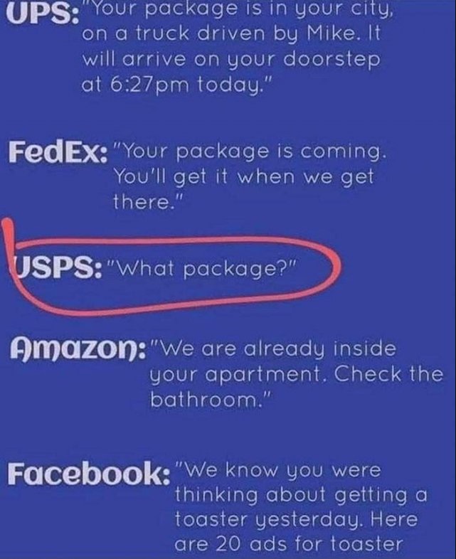 UPS, Fedex, USPS, Amazon, and Facebook. If you get USPS prepare for a lost package.
