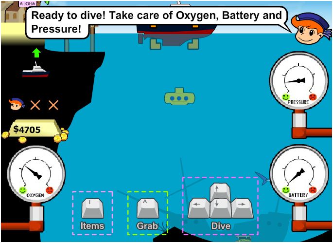 Dive your submarine for treasure. Get money from treasure to buy better sub. Go deeper for more gold