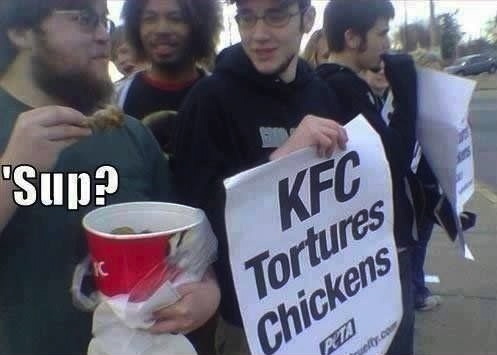 At a PETA protest defending "animal rights" and boycotting KFC's chicken handling methods, some guy pops up with a KFC bucket full of fried chicken.