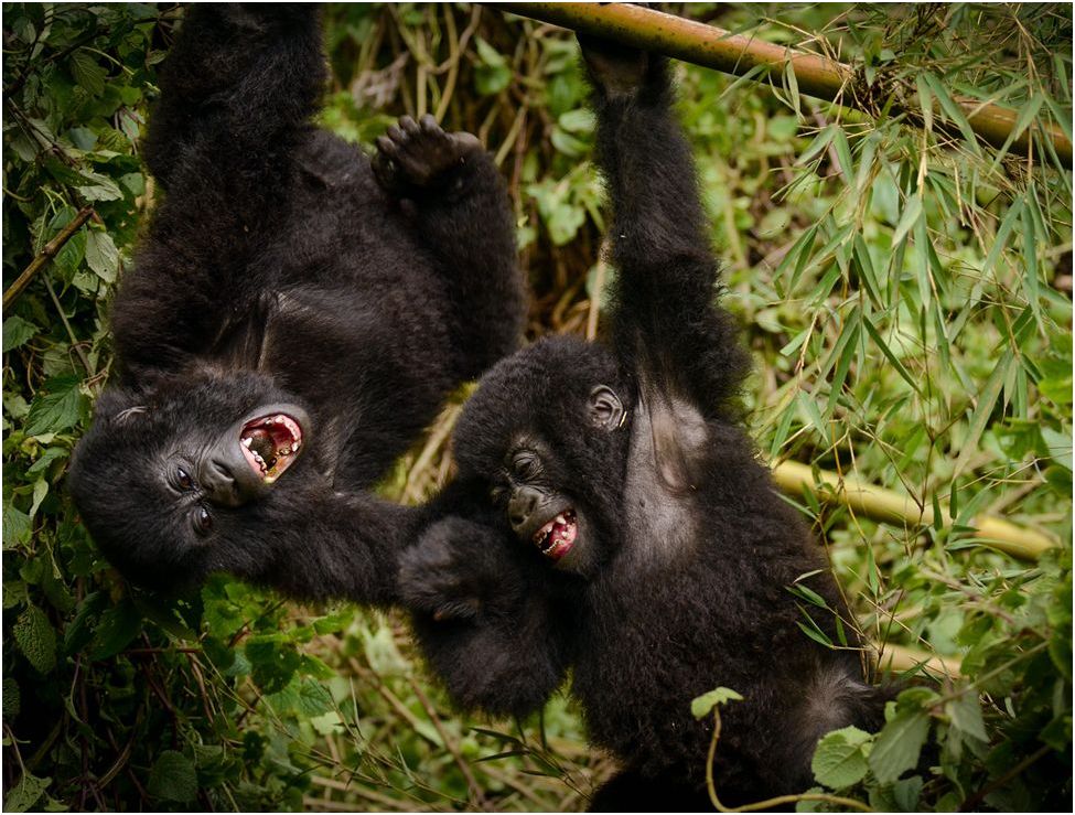 I took this photograph on the final day of a four-day trip to Volcanoes National Park in Rwanda. The two juvenile gorillas were playing endlessly, rumbling and tumbling as most of their family members of the Sabyinyo group relaxed and rested comfortably. Pouring over my shots following the trek, I was just as excited as the expression on their faces when I saw I had at least one photograph of the hundred or so I took of them in the midst of their debauchery.