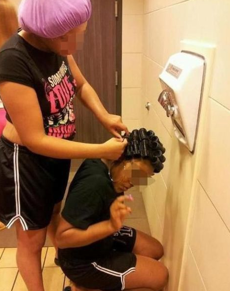 I walked in to the restroom and I seen these two ladies that were trying to dry their hair using the walmart hand dryer.