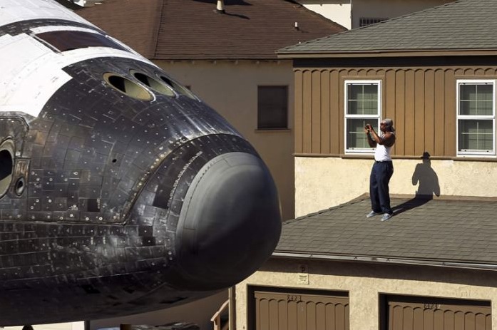 Guy is taking a picture of the space shuttle in his yard