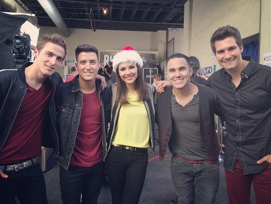 Victoria Justice gathers a few of her favorite guys in a group photo while on set for Big Time Rush.