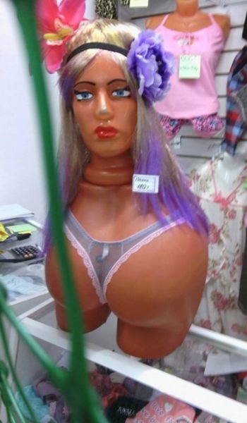 Here is a great idea for fashion. Put the doll head on the butt and you have a great selling display for underwear and wigs.