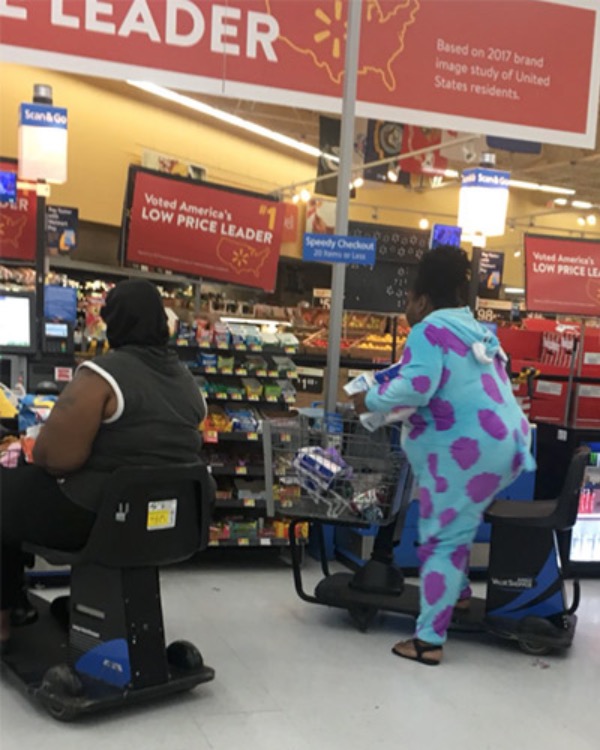 Wheeling around Walmart in a onesie with purple polka dots. That's how to scooter around in style.