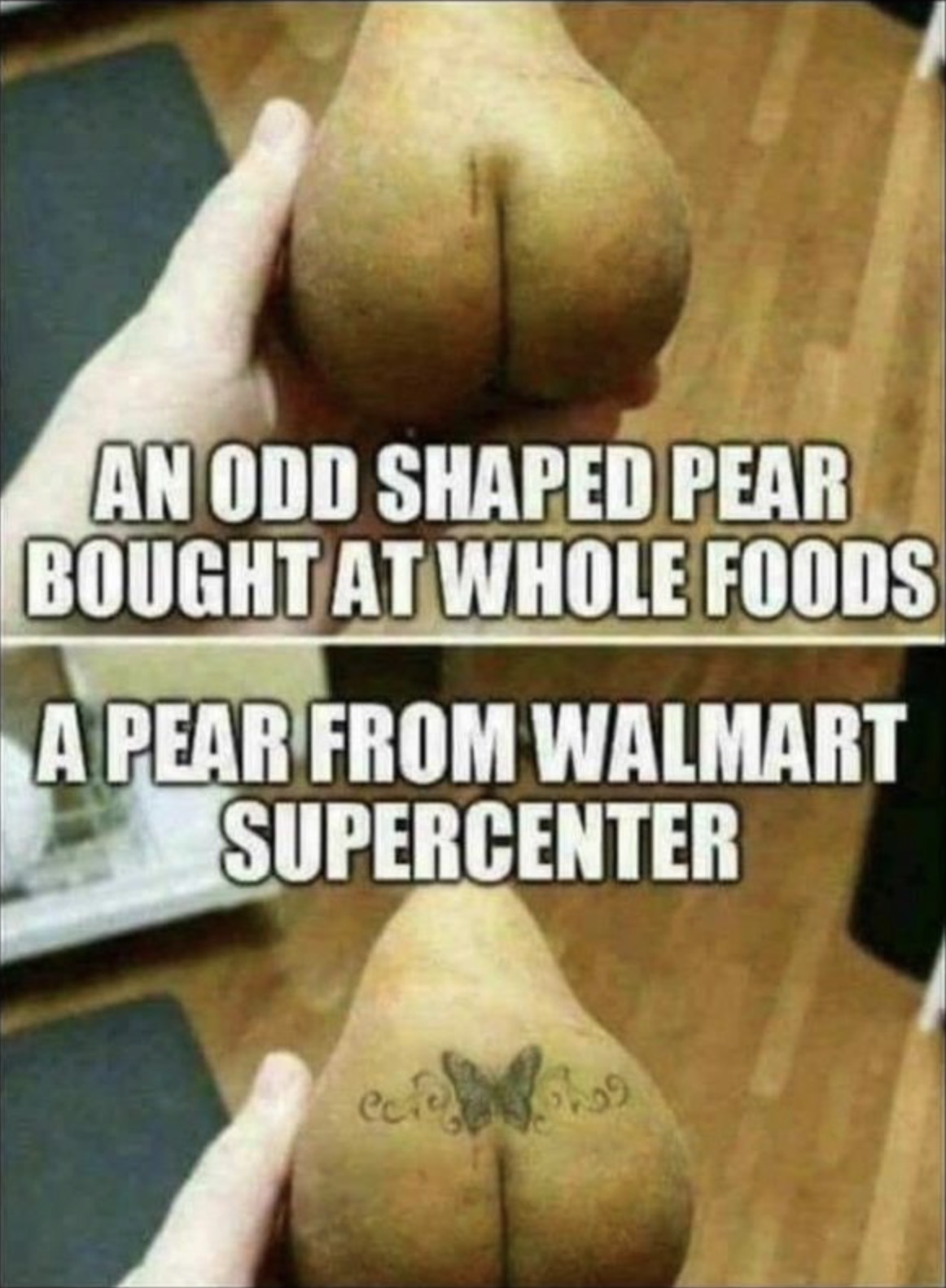 An odd shaped pear bought at Whole Foods vs a pear from Walmart super center.