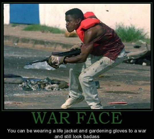 you can be wearing a life jacket and gardening gloves to a war and still look badass