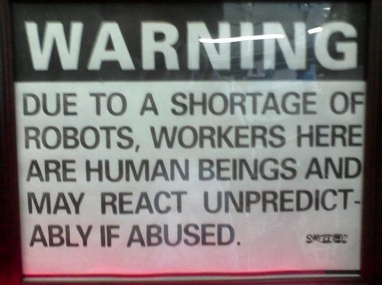 Warning - Due to a shortage of robots, workers here are human beings and may react unpredictably if abused.