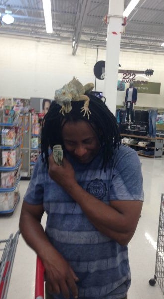 This iguana definitely fits in at walmart. You can see he's really comfortable with his surroundings. He's also sharply dressed which is a refreshing change.
