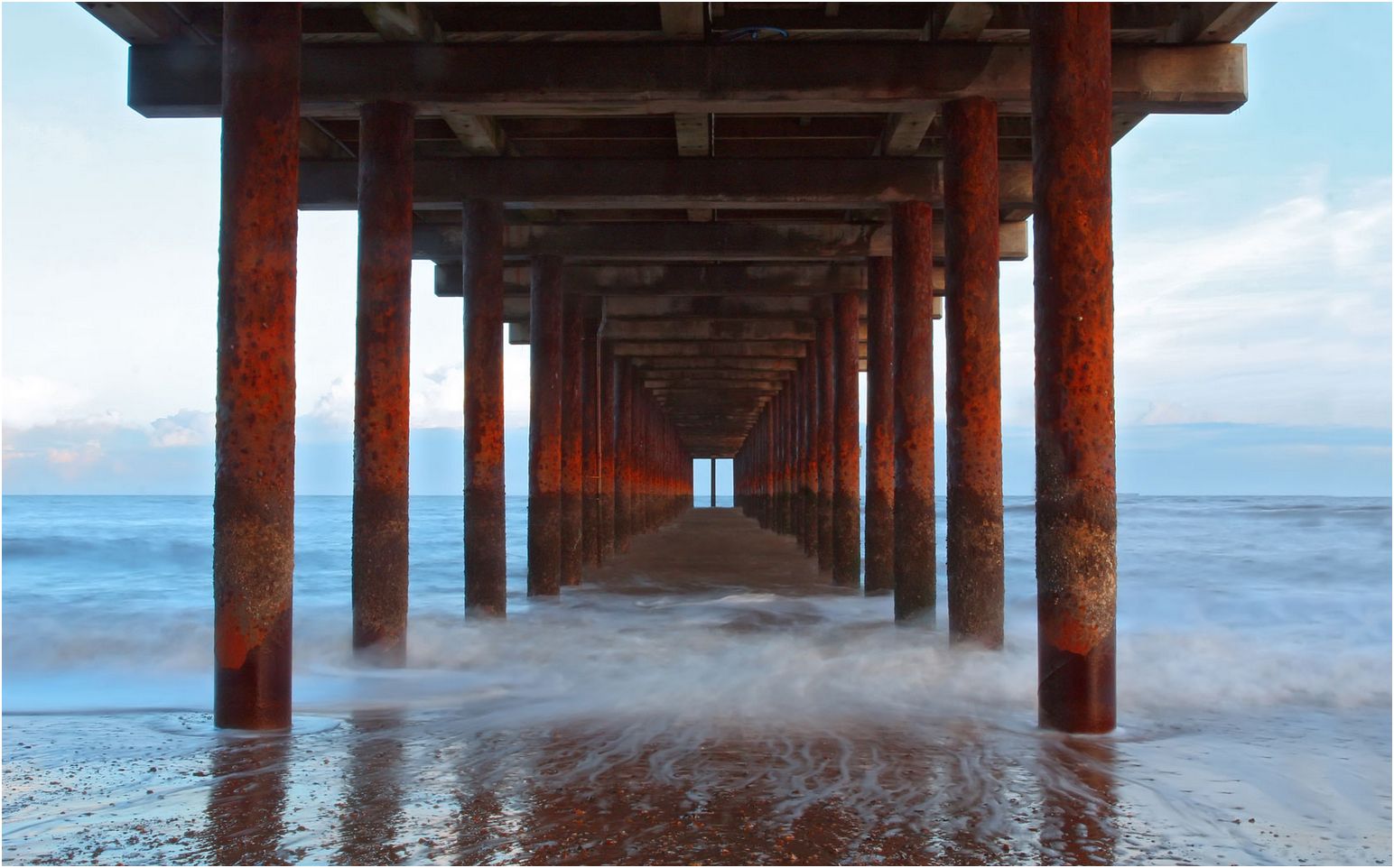 Waves under the pier at Daytona Beach Florida. North Atlantic Ocean waves are hitting the beach under the red piers.