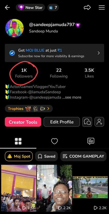 We have achieved 1k+ Small Family on Moj App. Thanks for this awesome love and support Guys, I am always bowing my head gratitude for this. 🙏😍😎😀