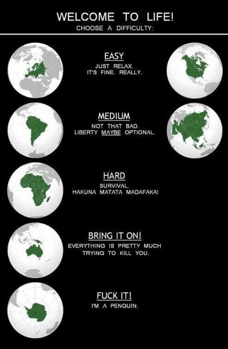 Set your difficulty mode on life. Choose from some of the best continents on earth to the worst like Antarctica. Penguins say fuck it.