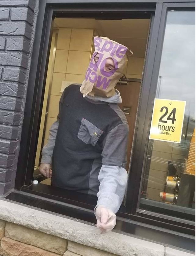 You can see the protective equipment is in short supply when the drive through worker has a bag over his head.