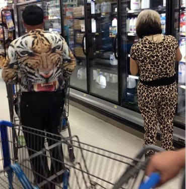 It's a real jungle out there. Just ask these folks. She's wearing a leopard print outfit and he's wearing an actual leopard. What a combination