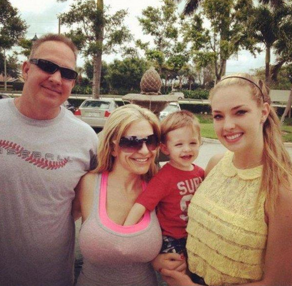 What a cute family portrait, I bet this one will go up in a livingroom wall, that way when you invite all your boring friends you will have lots to talk about. Like why the baby's hand is in your shirt???
