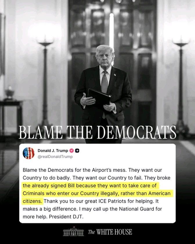 Blame the Democrats for the Airport’s mess. They want our Country to do badly. They want our Country to fail. They broke the already signed Bill because they want to take care of Criminals who enter our Country illegally, rather than American citizens. Thank you to our great ICE Patriots for helping. It makes a big difference. I may call up the National Guard for more help. President DJT.