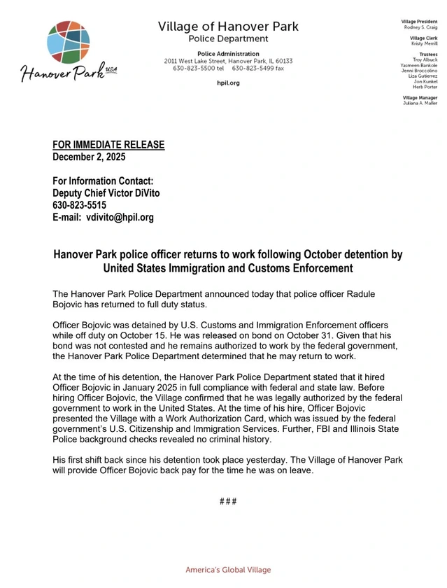 WHAT?! Radule Bojovic, the illegal alien caught working as a POLICE OFFICER in Hanover Park, IL, has RETURNED to duty after being arrested by ICE.