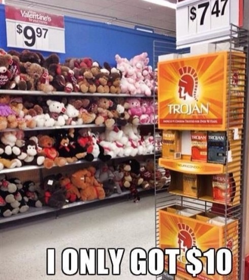Should I buy her a toy stuffed animal or get some condoms? I only have ten bucks. One is fun to squeeze the other would be hard.