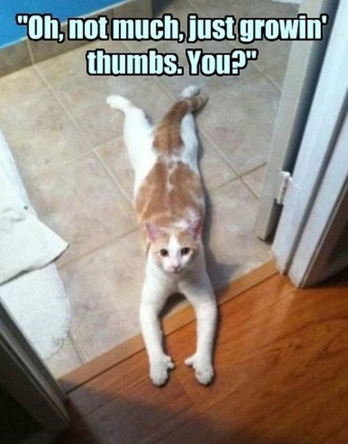 Oh not much just growin thumbs. You? I give this sprawled out cat two thumbs up for being extra relaxed. Not sure how those claws are digging in to the hardwood.
