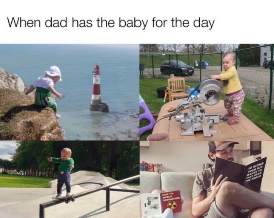 The baby gets to do whatever he wants: look down a cliff, play with an electric saw, skateboard down a railing, our read up on radioactivity.