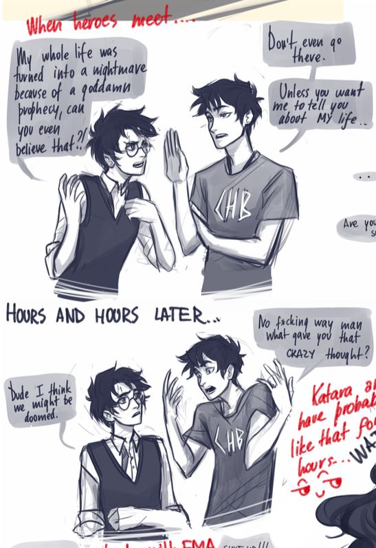 We can just imagine how these two epic heroes are extremely frustrated. If Harry Potter (from Harry Potter) and Percy Jackson (from Heroes of Olympus) they would obviously talk about how their lives suck because of a prophecy! Harry was predicted to defeat the evil Voldemort while Percy was the demigod who was predicted to save Olympus and the gods.