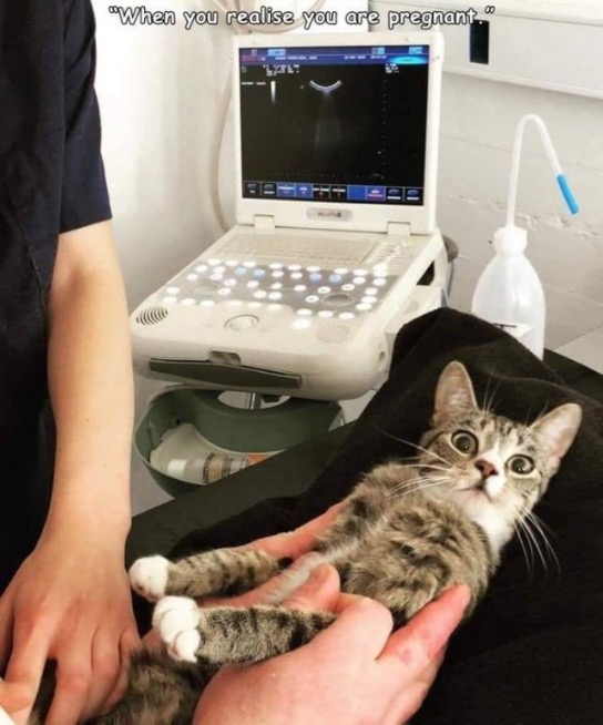 This cat looks really surprised. I'm sure she was expecting to have a litter.