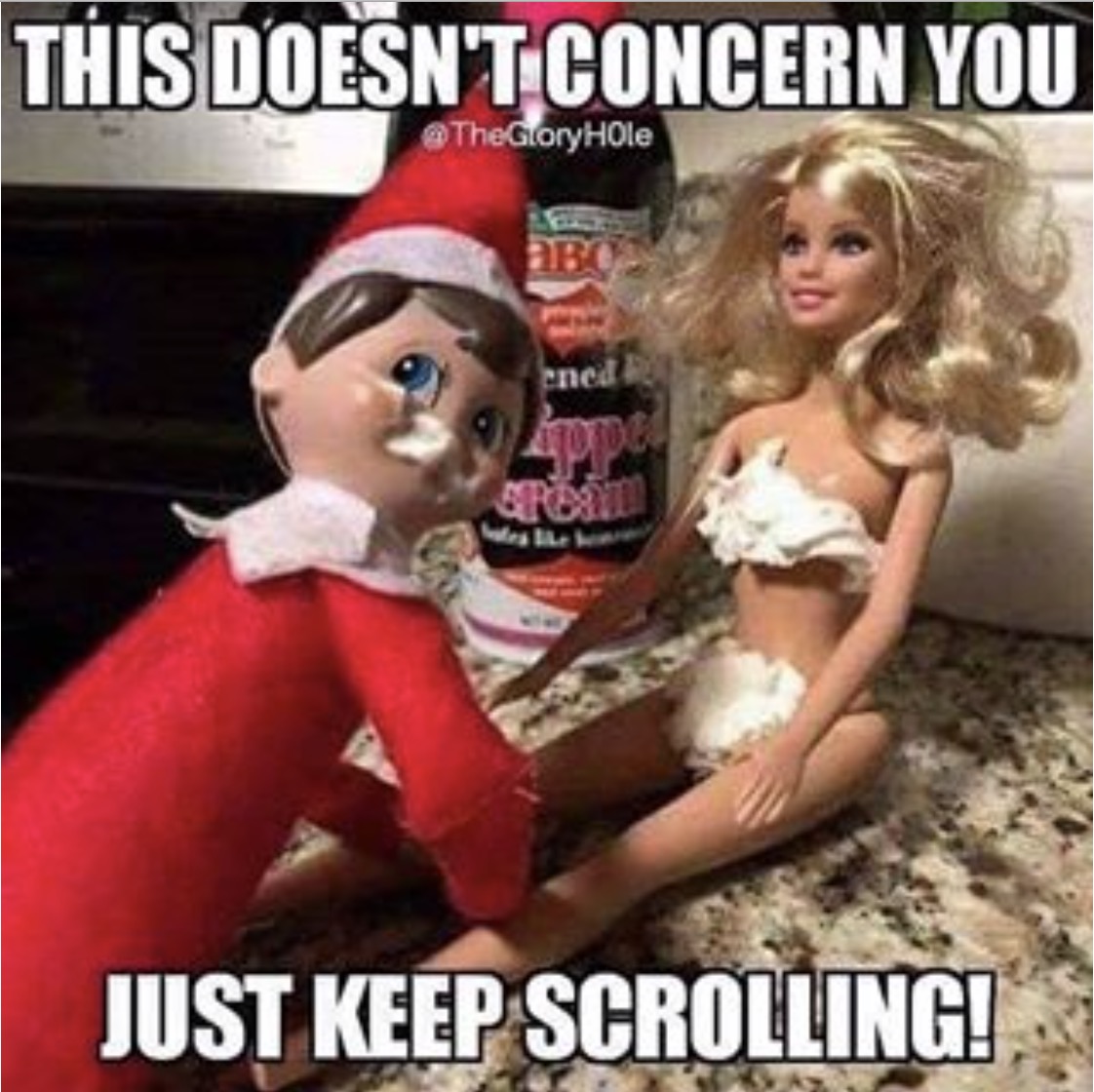 That awkward moment when you walk in on Barbie Doll and Elf and some whipped cream.