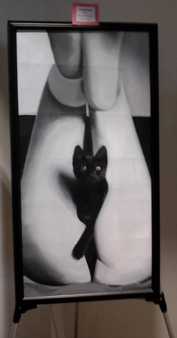 This is the first time I've ever seen a white girl with a black furry kitty! Very cute! The kitty looks like there's something fishy going on! Not sure how the kitty manages to stay put.