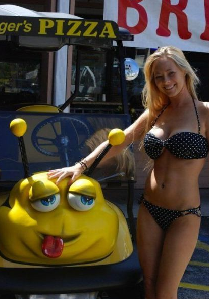 A model was trying to pose by a golf cart but the bee looks disgusted by the way the model is showing off her body.