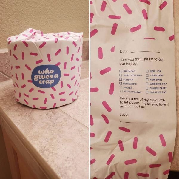 Dear ____ I bet you thought I'd forget but happy: birthday, sunday, christmas, mother's day, easter. Here's a roll of my favorite toilet paper. I hope you love it as much as I do.